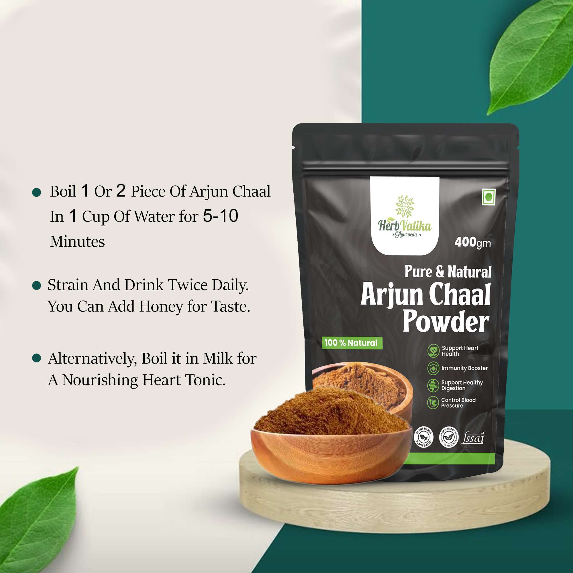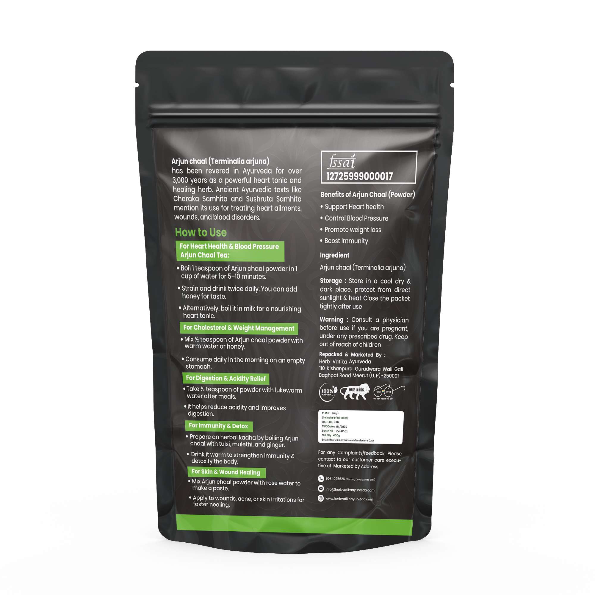 • Package material: 400 grams of Arjun Chaal, which has a 24-month shelf life.